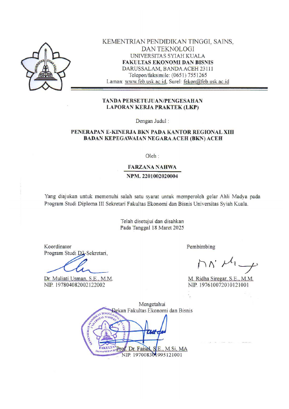 Farzana Nahwa, PENERAPAN E-KINERJA BKN PADA KANTOR REGIONAL XIII BADAN KEPEGAWIAN NEGARA ACEH (BKN) ACEH. Banda Aceh Fakultas Ekonomi dan Bisnis,2025