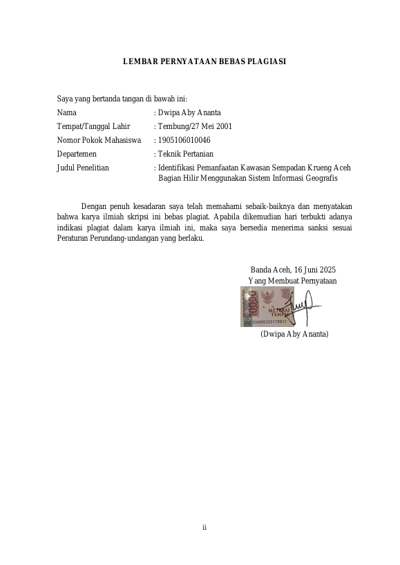 DWIPA ABY ANANTA, IDENTIFIKASI PEMANFAATAN KAWASAN SEMPADAN KRUENG ACEH BAGIAN HILIR MENGGUNAKAN SISTEM INFORMASI GEOGRAFIS. Banda Aceh Fakultas Pertanian Universitas Syiah Kuala,2025