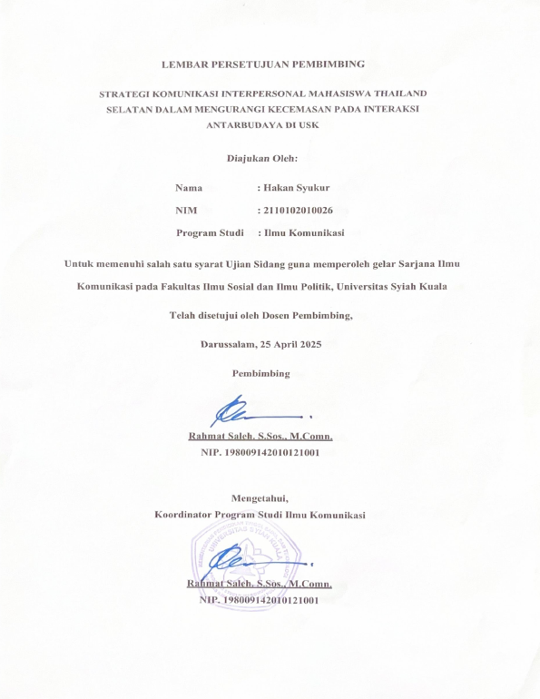 HAKAN SYUKUR, STRATEGI KOMUNIKASI INTERPERSONAL MAHASISWA THAILAND SELATAN DALAM MENGURANGI KECEMASAN PADA INTERAKSI ANTAR BUDAYA DI USK. Banda Aceh Fakultas Ilmu Sosial dan Ilmu Politik-Universitas Syiah Kuala,2025