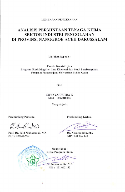 Edy Syahputra Z, ANALISIS PERMINTAAN TENAGA KERJA SEKTOR INDUSTRI PENGOLAHAN DI PROVINSI NANGGROE ACEH DARUSSALAM. Banda Aceh Prog. Studi Magister Ilmu Ekonomi,2003