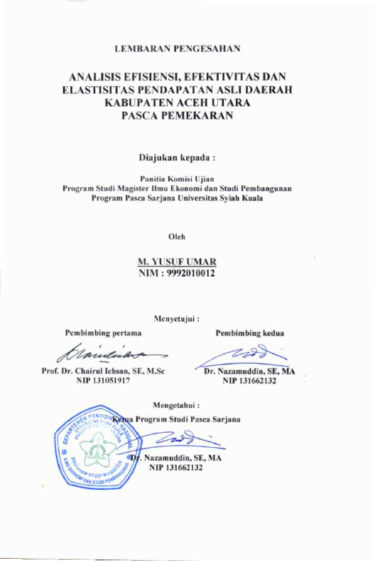 M Yusuf Umar, ANALISIS EFISIENSI, EFEKTIVITAS DAN ELASTISITAS PENDAPATAN ASLI DAERAH KABUPATEN ACEH UTARA PASCA PEMEKARA. Banda Aceh Program Studi Magister Ilmu Ekonomi,2004