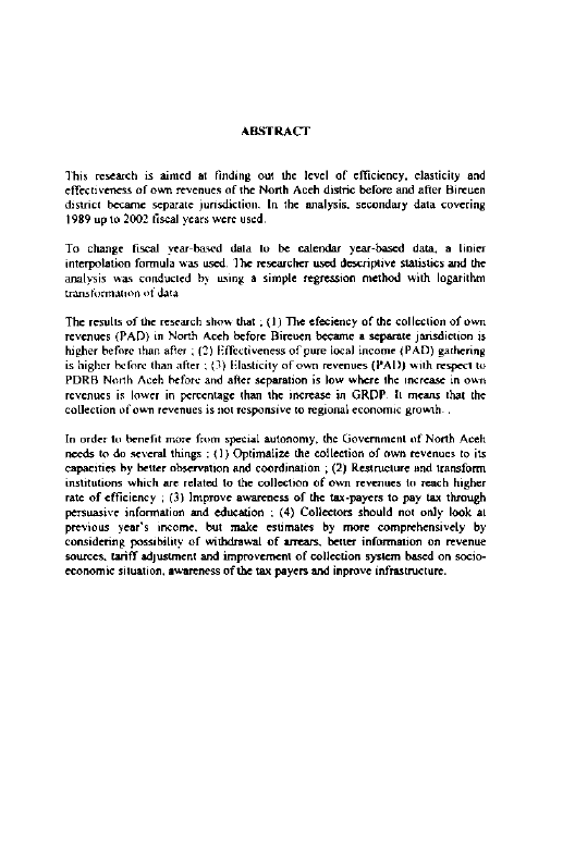 M Yusuf Umar, ANALISIS EFISIENSI, EFEKTIVITAS DAN ELASTISITAS PENDAPATAN ASLI DAERAH KABUPATEN ACEH UTARA PASCA PEMEKARA. Banda Aceh Program Studi Magister Ilmu Ekonomi,2004