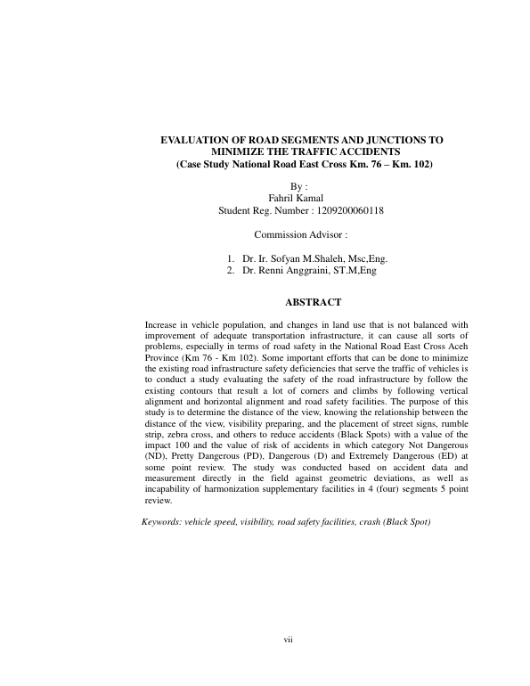 FAHRIL KAMAL, EVALUASI RUAS JALAN DAN PERSIMPANGAN UNTUKRNMEMINIMALKAN KECELAKAAN LALU LINTASRN(STUDI KASUS JALAN NASIONAL LINTAS TIMUR KM 76 – KM 102). Banda Aceh Fakultas Pasca Sarjana,2015