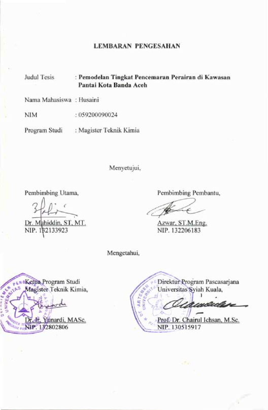 Husaini, PEMODELAN TINGKAT PENCEMARAN PERAIRAN DIKAWASAN PANTAI KOTA BANDA ACEH. Banda Aceh Prog. Studi Magister Teknik Kimia,2008