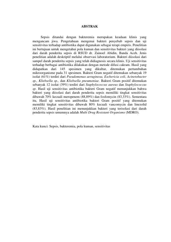 Baca Juga : ISOLASI, IDENTIFIKASI DAN UJI SENSITIVITAS BAKTERI PENYEBAB SEPSIS DI RSUD DR. ZAINOEL ABIDIN BANDA ACEH (Yuli Dwiharyani, 2015)