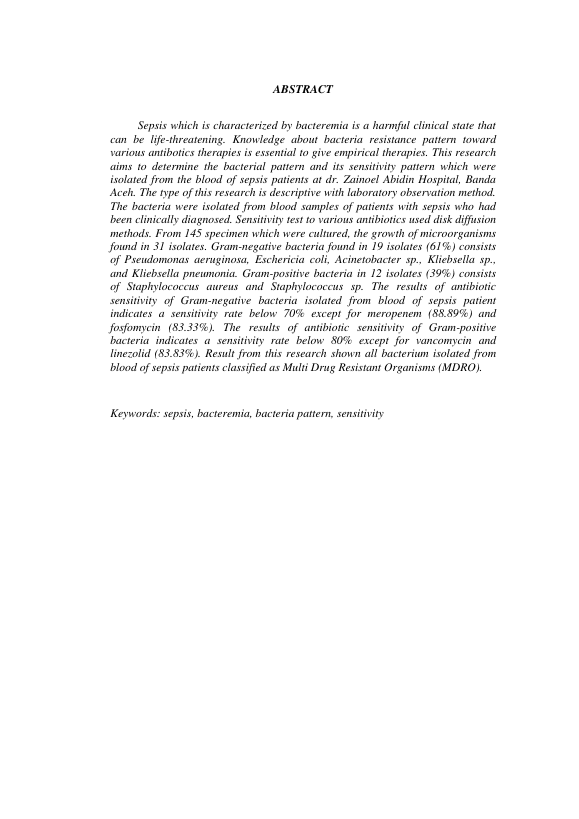 Yuli Dwiharyani, ISOLASI, IDENTIFIKASI DAN UJI SENSITIVITAS BAKTERI PENYEBAB SEPSIS DI RSUD DR. ZAINOEL ABIDIN BANDA ACEH. Banda Aceh Fakultas Kedokteran,2013