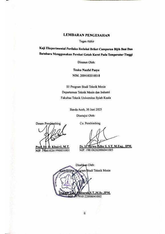 Baca Juga : KAJI EKSPERIMENTAL PERILAKU REDUKSI BRIKET CAMPURAN BIJI BESI DAN BATUBARA MENGGUNAKAN PEREKAT GETAH KARET PADA TEMPERATUR TINGGI (Teuku Naufal Pasya, 2025)