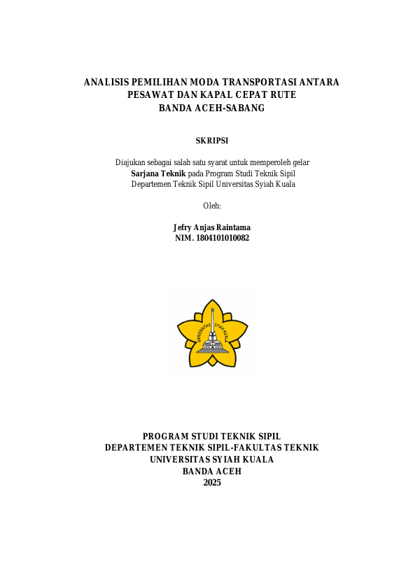 JEFRY ANJAS RAINTAMA, ANALISIS PEMILIHAN MODA TRANSPORTASI ANTARA PESAWAT DAN KAPAL CEPAT RUTE BANDA ACEH-SABANG. Banda Aceh Fakultas Teknik,2025