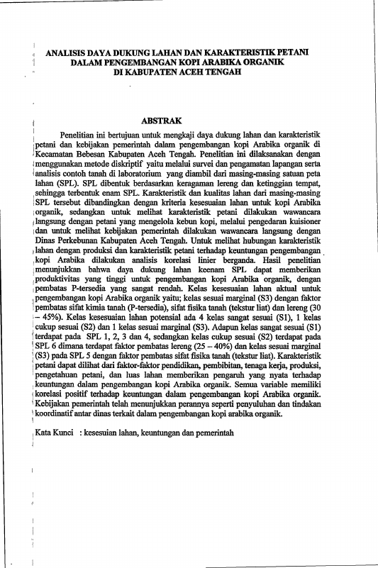 Busra Aradi, ANALISIS DAYA DUKUNG LAHAN DAN KARAKTERISTIK PETANI DALAM PENGEMBANGAN KOPI ARABIKA ORGANIK DI KABUPATEN ACEH TENGAH. Banda Aceh prog. studi magister pertanian,