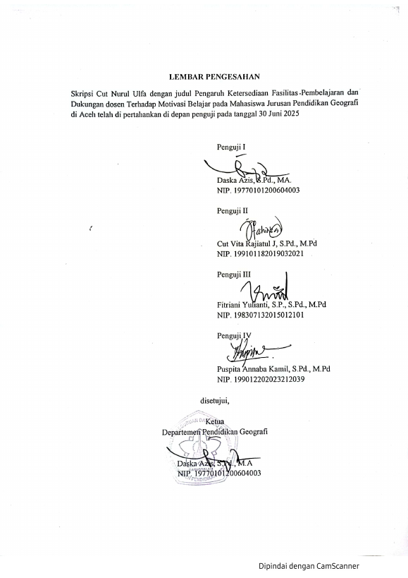 CUT NURUL ULFA, PENGARUH KETERSEDIAAN FASILITAS PEMBELAJARAN DAN DUKUNGAN DOSEN TERHADAP MOTIVASI BELAJAR PADA MAHASISWA JURUSAN PENDIDIKAN GEOGRAFI DI ACEH. Banda Aceh Fakultas FKIP (S1),2025