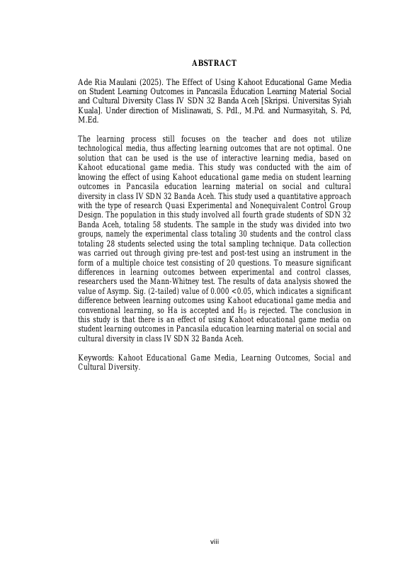 ADE RIA MAULANI, PENGARUH PENGGUNAAN MEDIA GAME EDUKASI KAHOOT TERHADAP HASIL BELAJAR PESERTA DIDIK PADA PEMBELAJARAN PENDIDIKAN PANCASILA MATERI KEBERAGAMAN SOSIAL DAN BUDAYA KELAS IV SDN 32 BANDA ACEH. Banda Aceh Fakultas FKIP,2025