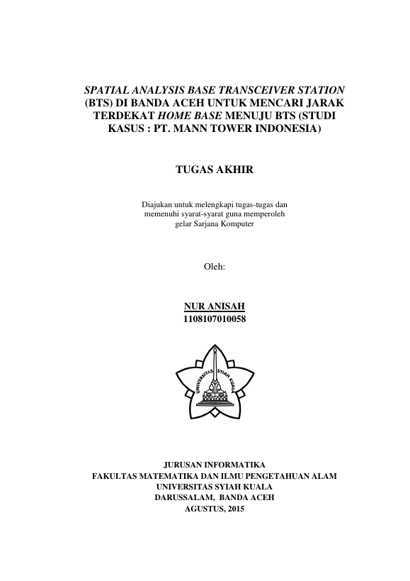 Baca Juga : SPATIAL ANALYSIS BASE TRANSCEIVER STATION (BTS) DI BANDA ACEH UNTUK MENCARI JARAK TERDEKAT HOME BASE MENUJU BTS (STUDI KASUS : PT. MANN TOWER INDONESIA) (Nur Anisah, 2015)