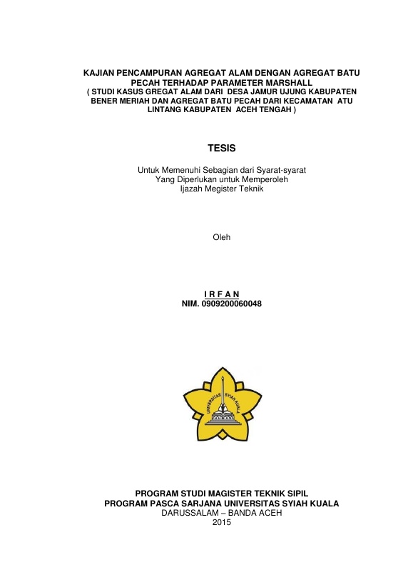 Baca Juga : PENGARUH PERSENTASE AGREGAT KASAR TANPA BIDANG PECAH TERHADAP KARAKTERISTIK MARSHALL CAMPURAN BETON ASPAL AC-WC (TINJAUAN GRADASI AGREGAT BATAS ATAS MENGGUNAKAN ASPAL PEN. 60/70) (TEUKU SAIFUL AMRI, 2015)