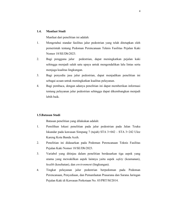 Baca Juga : ANALISIS TINGKAT KEPUASAN DAN KEPENTINGAN PENGGUNA FASILITAS JALUR PEDESTRIAN BERDASARKAN ASPEK SAFETY, HEALTH, AND ENVIRONMENT DI KAWASAN PASAR ACEH, BANDA ACEH (ANALYSIS OF USER SATISFACTION AND IMPORTANCE LEVEL OF PEDESTRIAN PATH FACILITIES BASED ON SAFETY, HEALTH, AND ENVIRONMENT ASPECTS IN PASAR ACEH AREA, BANDA ACEH) (Dian Firouza Meutia, 2020)