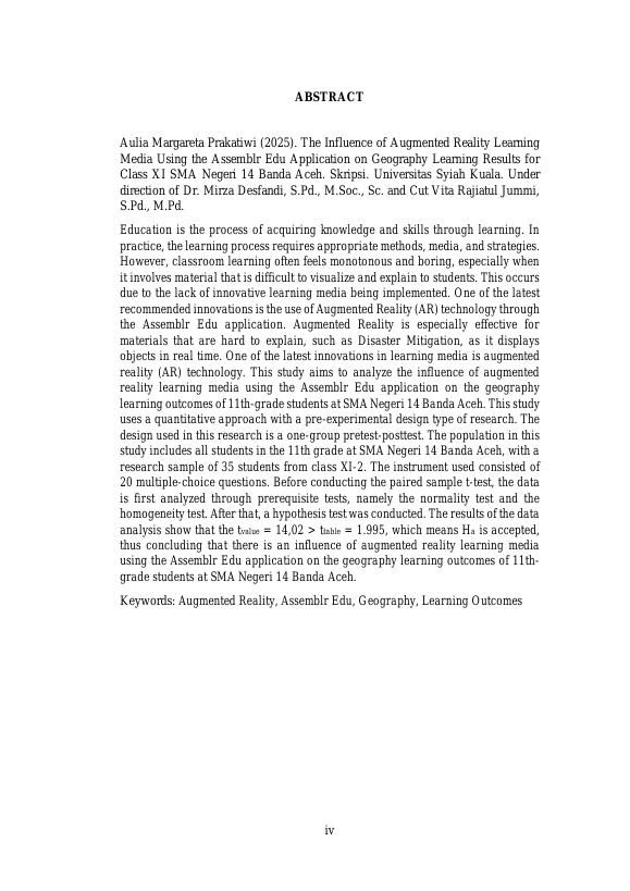 Aulia Margareta Prakatiwi, PENGARUH MEDIA PEMBELAJARAN AUGMENTED REALITY MENGGUNAKAN APLIKASI ASSEMBLR EDU TERHADAP HASIL BELAJAR GEOGRAFI KELAS XI SMA NEGERI 14 BANDA ACEH. Banda Aceh Fakultas FKIP (S1),2025