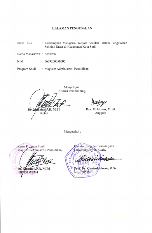 Amirzan, KEMAMPUAN MANAJERIAL KEPALA SEKOLAH DALAM PENGELOLAAN SEKOLAH DASAR DI KECAMATAN KOTA SIGLI. Banda Aceh prog. studi magister pendidikan,
