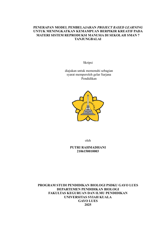 PUTRI RAHMADHANI, PENERAPAN MODEL PEMBELAJARAN PROJECT BASED LEARNING UNTUK MENINGKATKAN KEMAMPUAN BERPIKIR KREATIF PADA MATERI SISTEM REPRODUKSI MANUSIA DI SEKOLAH SMAN 7 TANJUNGBALAI. Banda Aceh Fakultas KIP,2025