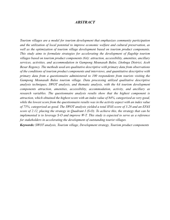 Durri Mustika, STRATEGI PERCEPATAN PENGEMBANGAN DESA WISATA UNGGULAN BERBASIS KOMPONEN PRODUK PARIWISATA (STUDI KASUS: GAMPONG MEUNASAH BALEE, KECAMATAN LHOKNGA, KABUPATEN ACEH SELATAN). Banda Aceh Fakultas Teknik,2025