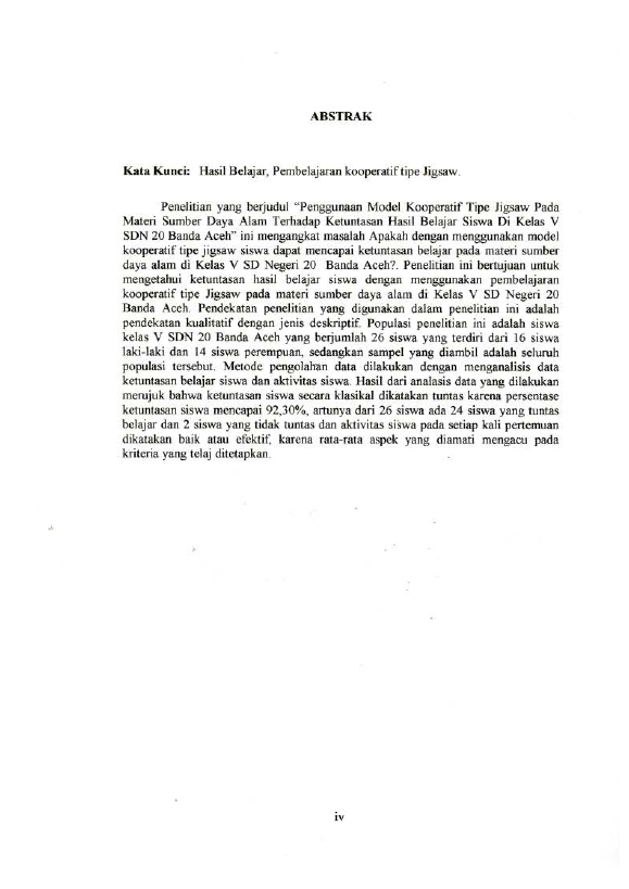 RUSDIANTO, PENGGUNAAN MODEL KOOPERATIF TIPE JIGSAW PADA MATERI SUMBER DAYA ALAM TERHADAP KETUNTASAN HASIL BELAJAR SISWA DI KELAS V SDN 20 BANDA ACEH. Banda Aceh Fakultas Keguruan dan Ilmu Pendidikan,2015