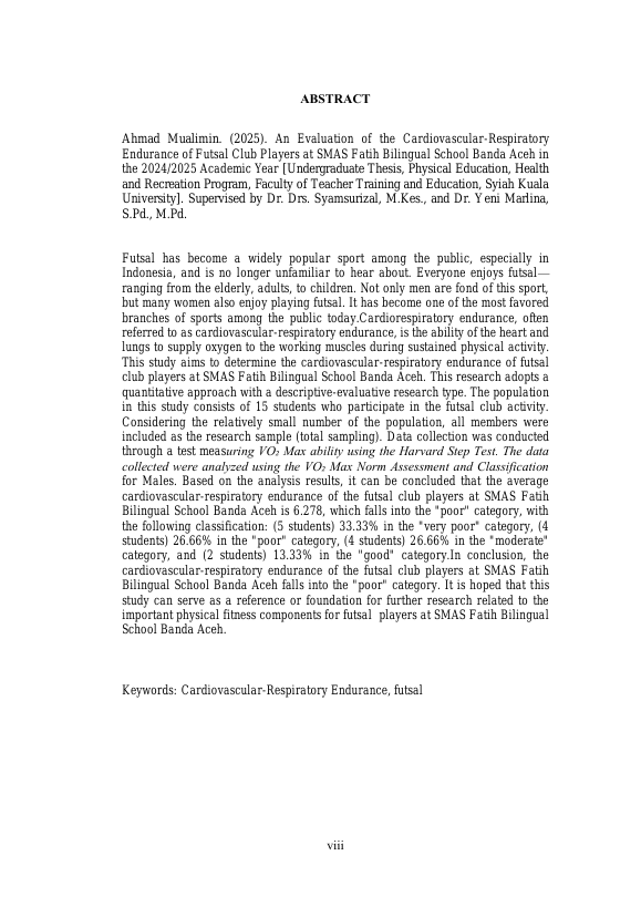 AHMAD MUALIMIN, EVALUASI KEMAMPUAN KARDIOVASKULAR RESPIRASI PEMAIN KLUB FUTSAL SMAS FATIH BILINGUAL SCHOOL BANDAACEH TAHUN AJARAN 2024/2025. Banda Aceh Fakultas KIP,2025