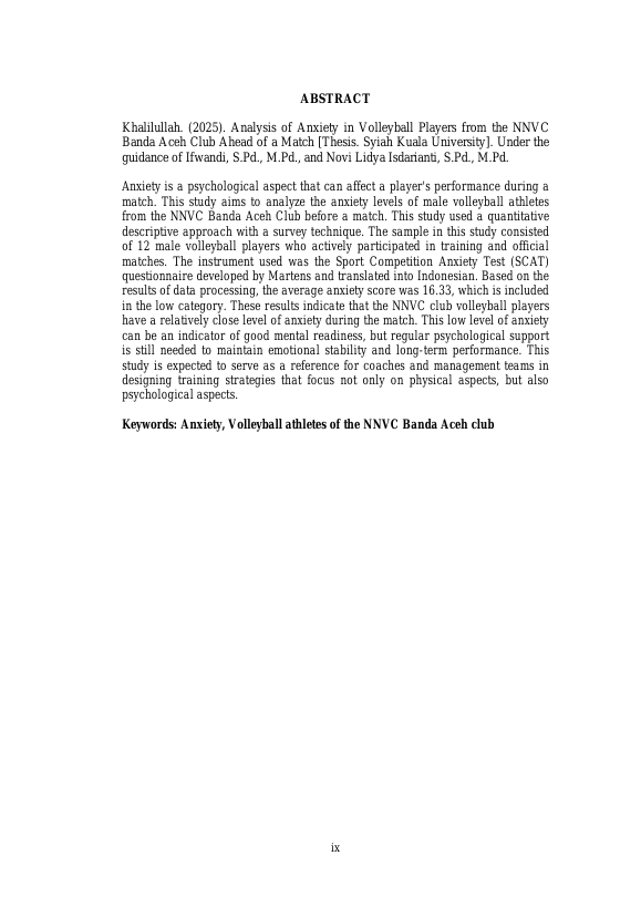 Khalilullah, ANALISIS KECEMASAN ATLET BOLA VOLI KLUB NNVC BANDA ACEH MENJELANG PERTANDINGAN. Banda Aceh Fakultas KIP,2025