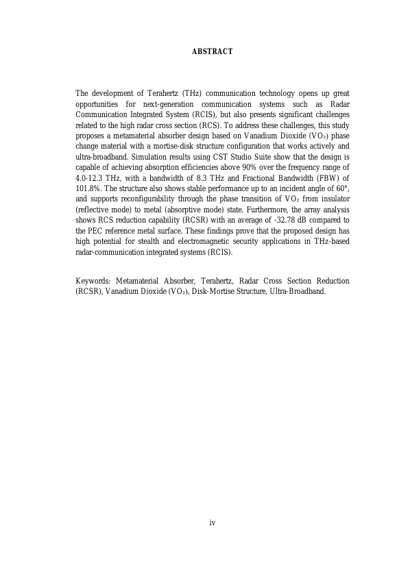 Rodhatul Munawarah, DESAIN METAMATERIAL ABSORBER BERBASIS VANADIUM DIOKSIDA MENGGUNAKAN DISK-MORTISE STRUCTURE UNTUK TEKNOLOGI KOMUNIKASI TERAHERTZ. Banda Aceh Fakultas Teknik Elektro,2025