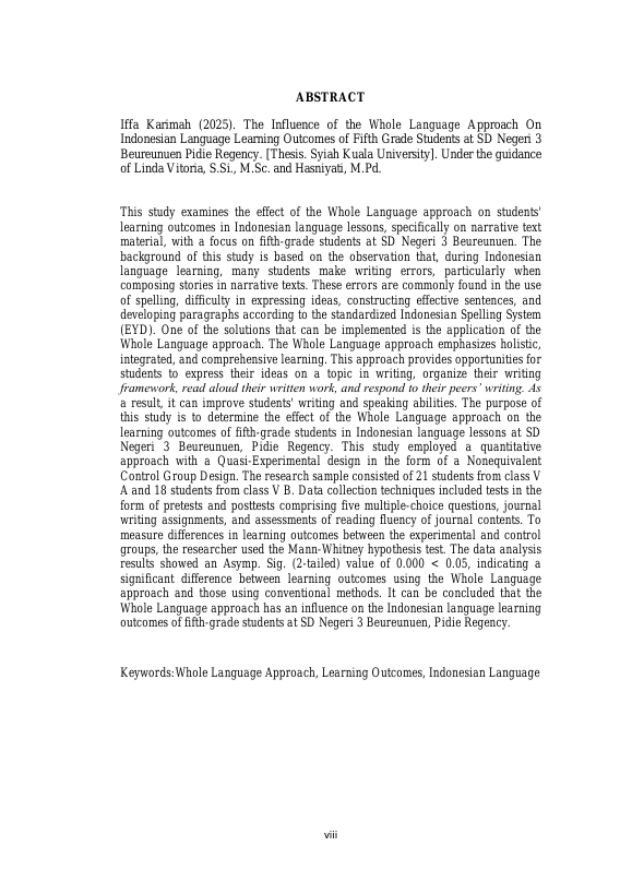 IFFA KARIMAH, PENGARUH PENDEKATAN WHOLE LANGUAGE TERHADAP HASIL BELAJAR BAHASA INDONESIA PADA PESERTA DIDIK KELAS V SD NEGERI 3 BEUREUNUEN KABUPATEN PIDIE. Banda Aceh Fakultas KIP,2025