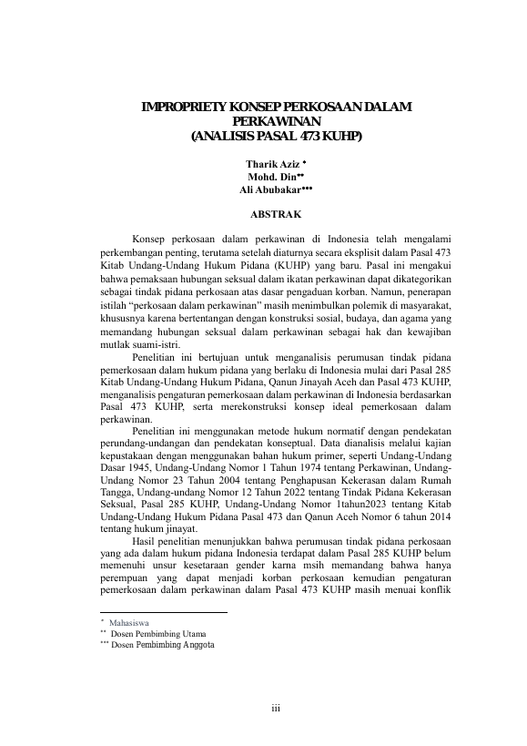 Tharik Aziz, IMPROPRIETY KONSEP PERKOSAAN DALAM PERKAWINAN (ANALISIS PASAL 473 KUHP). Banda Aceh Program Studi Magister Ilmu Hukum,2025