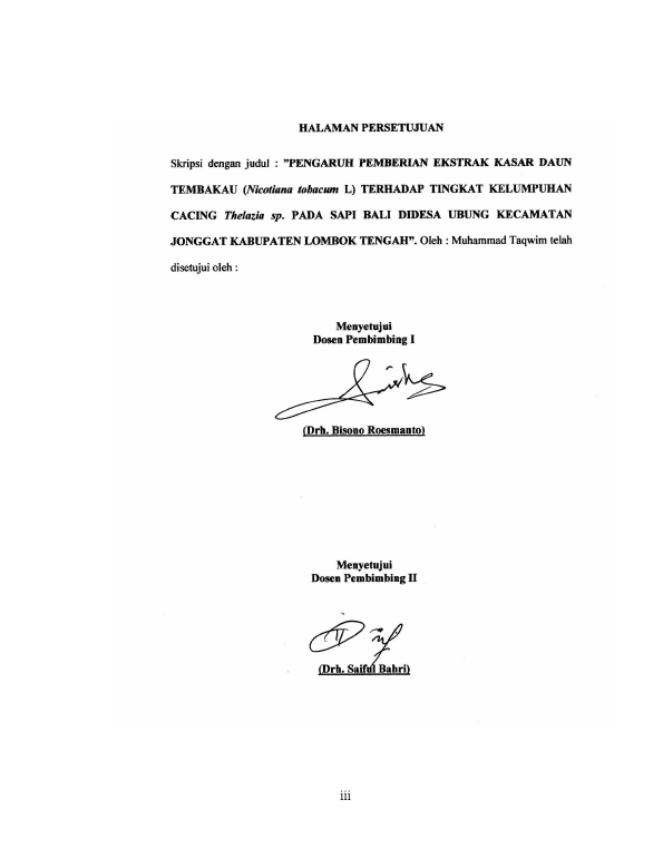 Muhammad Taqwim, PENGARUH PEMBERIAN EKSTRAK KASAR DAUN TEMBAKAU (NICOTIANA TOBACUM L) TERHADAP TINGKAT KELUMPUHAN CACING THELAZIA SP. PADA SAPI BALI DI DESA UBUNG KECAMATAN JONGGAT KABUPATEN LOMBOK TENGAH TAHUN 2013. Banda Aceh Universitas Syiah Kuala,2015