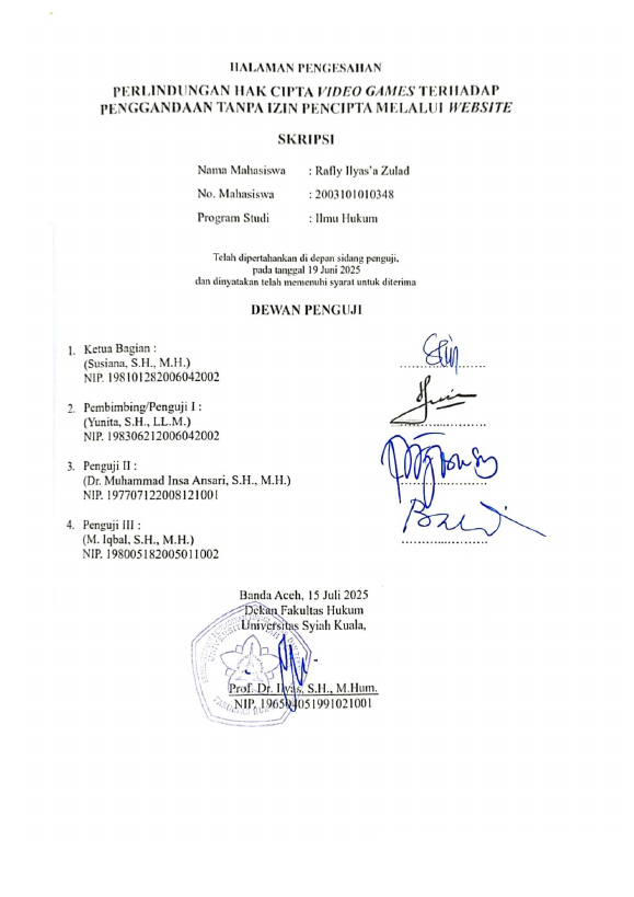 Rafly Ilyas'a Zulad, PERLINDUNGAN HAK CIPTA VIDEO GAMES TERHADAP PENGGANDAAN TANPA IZIN PENCIPTA MELALUI WEBSITE. Banda Aceh Fakultas Hukum,2025