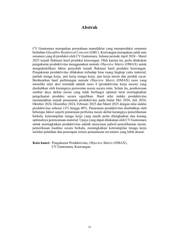 Baca Juga : ANALISIS PENGUKURAN PRODUKTIVITAS PROSES PRODUKSI DI WTM 8 PLANT MENGGUNAKAN METODE OBJECTIVE MATRIX (OMAX) (STUDI KASUS : PT BAKRIE PIPE INDUSTRIES) (Diva Fachriza, 2024)