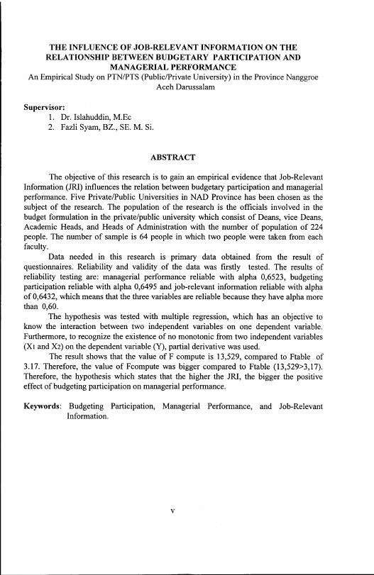 Yusri Hazmi, PENGARUH JOB-RELEVANT INFORMATION TERHADAP HUBUNGAN ANTARA PARTISIPASI PENGANGGARAN DAN KINER.JA MANAJERIAL STUDI EMPIRIS PADA PTNPTS (PERGURUAN TINGGI NEGERI SWASTA) DI PROVINSI NANGGROE ACEH DARUSSALAM. Banda Aceh Program Studi Magister Akuntansi,2007