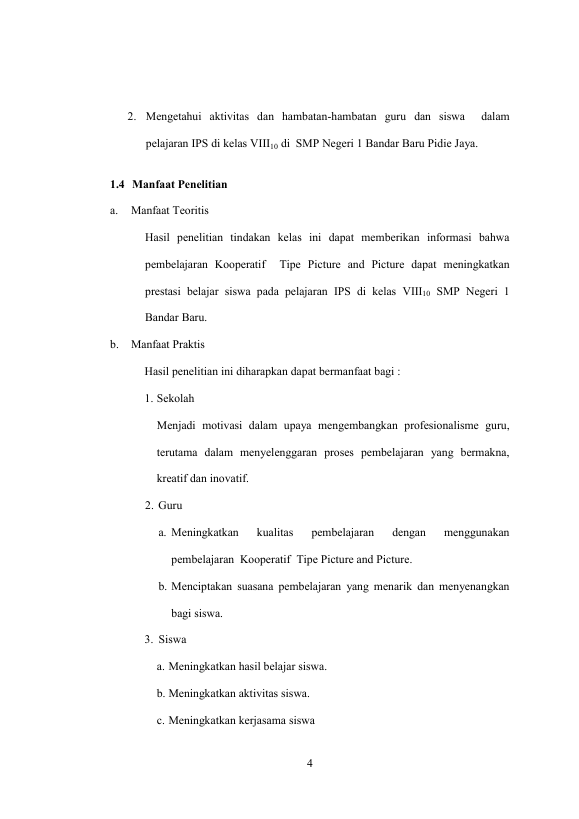 Baca Juga : PERBANDINGAN PRESTASI BELAJAR SISWA KELAS VII DENGAN MENGGUNAKAN MODEL PEMBELAJARAN KOOPERATIF TIPE PICTURE AND PICTURE PADA MATERI APRESIASI TARI TRADISIONAL DAERAH SETEMPAT DI SMPN 5 BANDAR BARU KABUPATEN PIDIE JAYA (Isnaniah, 2014)