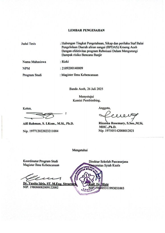 Rizki, HUBUNGAN TINGKAT PENGETAHUAN, SIKAP DAN PERILAKU STAF BALAI PENGELOLAAN DAERAH ALIRAN SUNGAI (BPDAS) KRUENG ACEH DENGAN EFEKTIVITAS PROGRAM REBOISASI DALAM MENGURANGI DAMPAK RISIKO BENCANA BANJIR. Banda Aceh Fakultas Magister Ilmu Kebencanaan,2025
