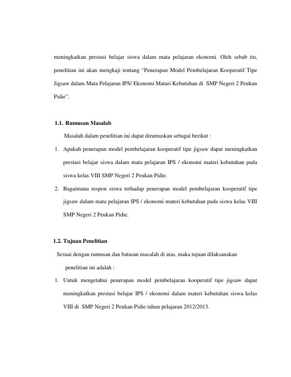 RAZALI, PENERAPAN MODEL PEMBELAJARAN KOOPERATIF TIPE JIGSAW DALAM MATA PELAJARAN IPS / EKONOMI MATERI KEBUTUHAN DI SMP NEGERI 2 PEUKAN PIDIE. Banda Aceh Fakultas Keguruan dan Ilmu Pendidikan,2013