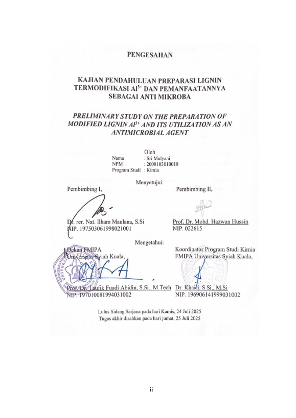 SRI MULYANI, KAJIAN PENDAHULUAN PREPARASI LIGNIN TERMODIFIKASI AL3+ DAN PEMANFAATANNYA SEBAGAI ANTI MIKROBA. Banda Aceh Fakultas mipa,2025