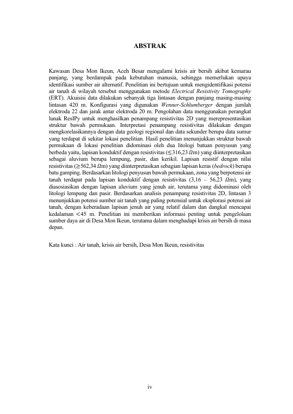 Adila Latifa, INTERPRETASI STRUKTUR BAWAH PERMUKAAN UNTUK POTENSI AIR TANAH MENGGUNAKAN METODE ELECTRICAL RESISTIVITY TOMOGRAPHY (ERT) DI DESA MON IKEUN, ACEH BESAR. Banda Aceh Fakultas MIPA (S1),2025