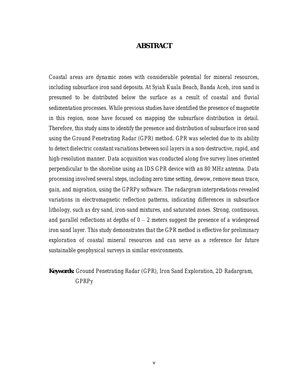 Eka Novita, PENGGUNAAN METODE GROUND PENETRATING RADAR (GPR) UNTUK EKSPLORASI PASIR BESI DI PANTAI SYIAH KUALA, BANDA ACEH. Banda Aceh Fakultas mipa,2025