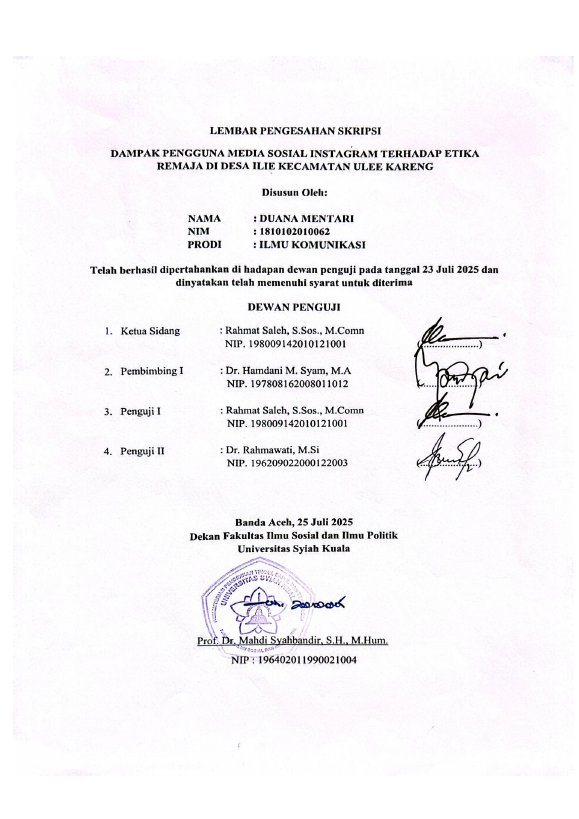 DUANA MENTARI, DAMPAK PENGGUNA MEDIA SOSIAL INSTAGRAM TERHADAP ETIKA REMAJA DI DESA ILIE KECAMATAN ULEE KARENG. Banda Aceh Fakultas Ilmu Sosial dan Ilmu Politik-Universitas Syiah Kuala,2025