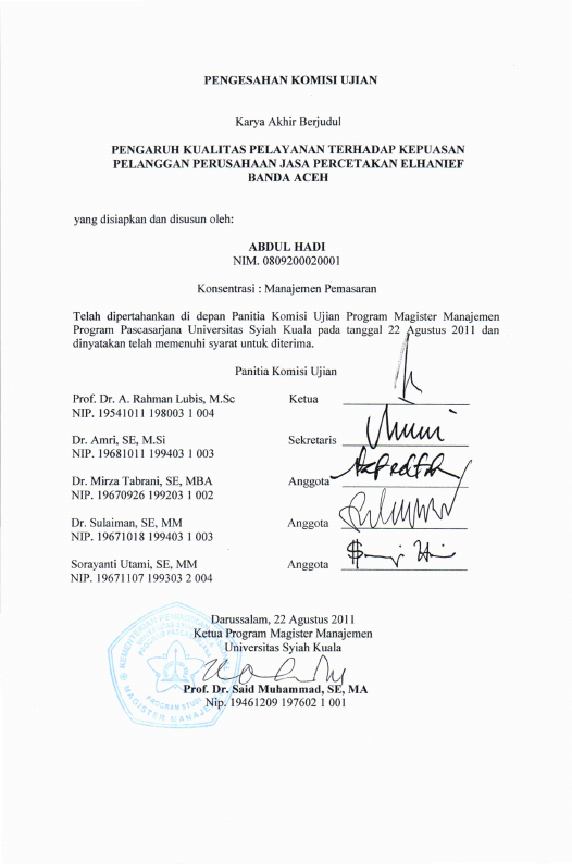 Abdul Hadi, PENGARUH KUALITAS PELAYANAN TERHADAP KEPUASAN PELANGGAN PERUSAHAAN JASA PERCETAKAN ELHANIEF BANDA ACEH. Banda Aceh Program Studi Magister Manajemen,2025