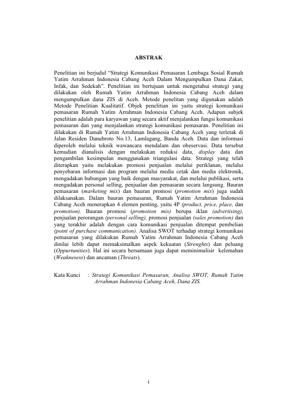 Syaiful Bahri Sinuhaji, STRATEGI KOMUNIKASI PEMASARAN LEMBAGA SOSIAL RUMAH YATIM ARRAHMAN INDONESIA CABANG ACEH DALAM MENGUMPULKAN DANA ZAKAT, INFAQ, DAN SEDEKAH. Banda Aceh Fakultas Ilmu Sosial dan Ilmu Politik-Universitas Syiah Kuala,2015