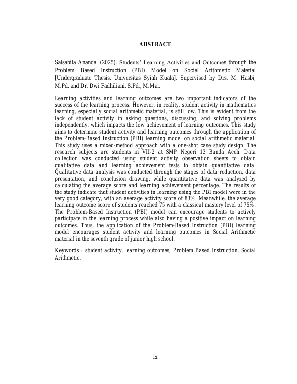 SALSABILA ANANDA, AKTIVITAS DAN HASIL BELAJAR SISWA MELALUI MODEL PEMBELAJARAN PROBLEM BASED INSTRUCTION PADA MATERI ARITMATIKA SOSIAL. Banda Aceh Fakultas KIP,2025