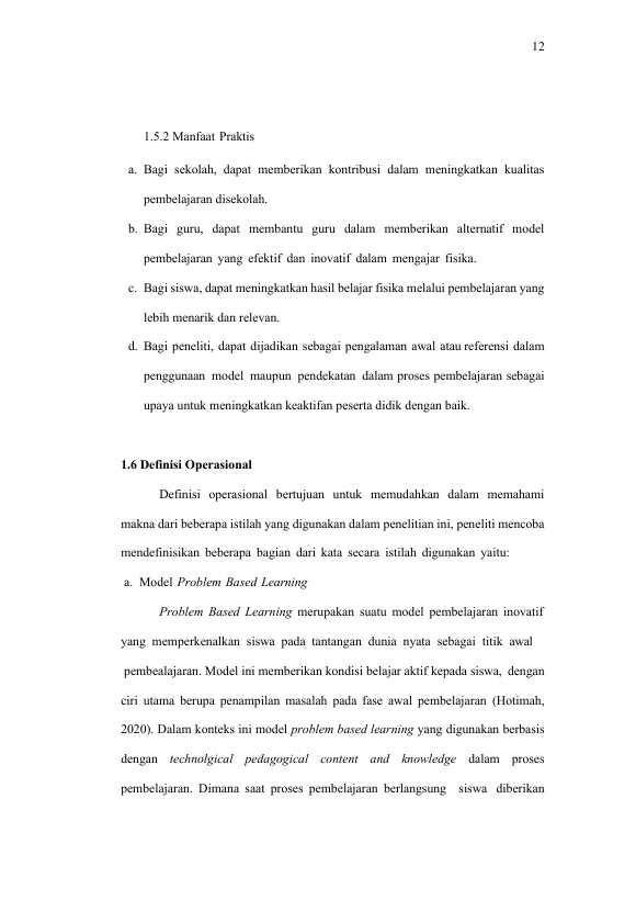 ELA ANIS MANIDAR, PENGARUH MODEL PROBLEM BASED LEARNING BERBASIS TECHNOLOGICAL PEDAGOGICAL AND CONTENT KNOWLEDGE (TPACK) TERHADAP HASIL BELAJAR FISIKA SSIWA. Banda Aceh Fakultas KIP,2025