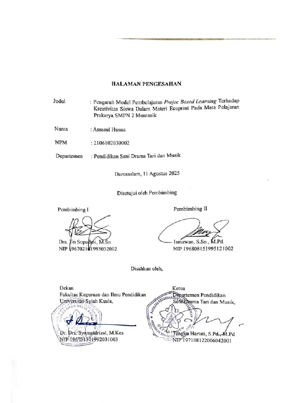 Baca Juga : PENGARUH PENERAPAN MODEL PEMBELAJARAN PROJECT BASED LEARNING UNTUK MENINGKATKAN KREATIVITAS SISWA PADA MATERI MUSIK TRADISI DI KELAS VII SMPN 2 DARUL IMARAH (Siti Aulia Putri, 2025)