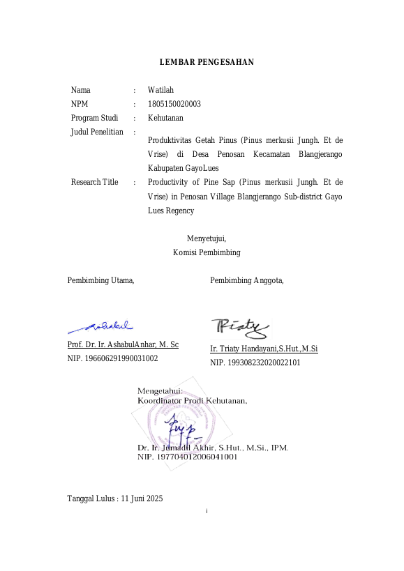 Watilah, PRODUKTIVITAS GETAH PINUS ( PINUS MERKUSII JUNGH. ET DE VRISE) DI DESA PENOSAN KECAMATAN BLANGJERANGO KABUPATEN GAYO LUES. Banda Aceh Fakultas Pertanian - Kehutanan,2025