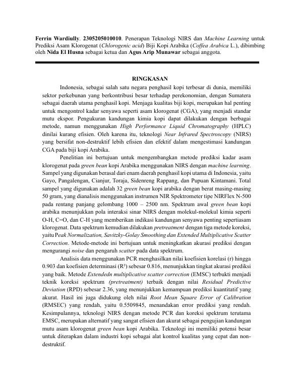 Ferrin Wardiully, MODEL TEKNOLOGI NIRS DAN MACHINE LEARNING UNTUK PREDIKSI ASAM KLOROGENAT (CHLOROGENIC ACID) BIJI KOPI ARABIKA (COFFEA ARABICA L.). Banda Aceh Fakultas Magister Pertanian,2025