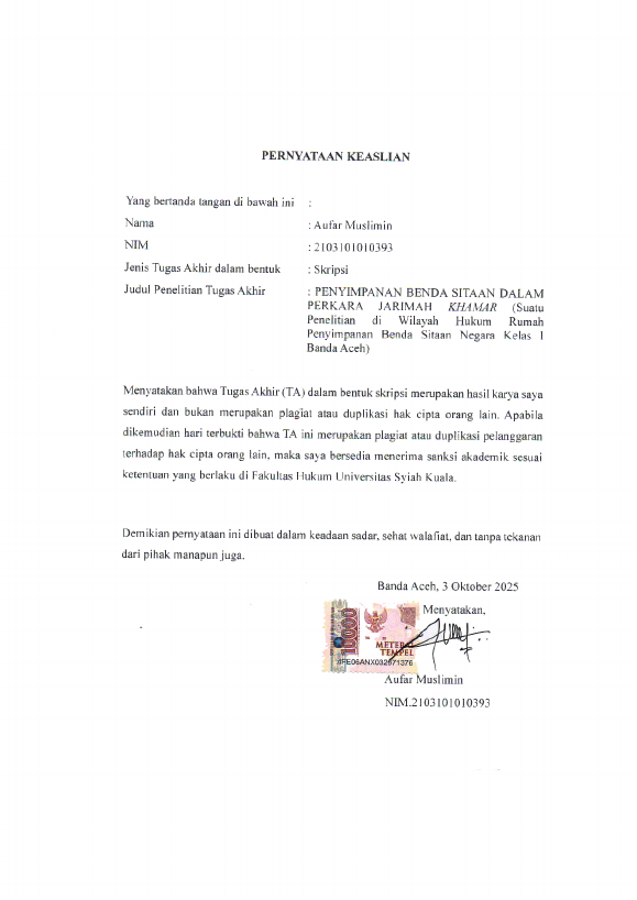 Baca Juga : PENYIMPANAN DAN PENGELOLAAN BENDA SITAAN PERKARA PIDANA (SUATU PENELITIAN DI RUMAH PENYIMPANAN BENDA SITAAN NEGARA KELAS I BANDA ACEH) (AUZAN MUKMININ, 2025)