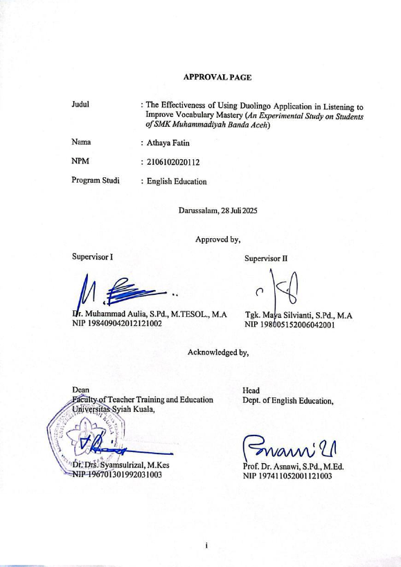 ATHAYA FATIN, THE EFFECTIVENESS OF USING DUOLINGO APPLICATION IN LISTENING TO IMPROVE VOCABULARY MASTERY (AN EXPERIMENTAL STUDY ON STUDENTS OF SMK MUHAMMADIYAH BANDA ACEH). Banda Aceh Fakultas FKIP (S1),2025