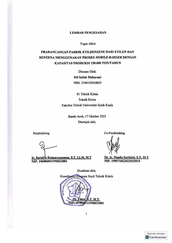 Baca Juga : PRARANCANGAN PABRIK ETILBENZENE DARI ETILEN DAN BENZENE MENGGUNAKAN PROSES MOBILE-BADGER DENGAN KAPASITAS PRODUKSI 150.000 TON/TAHUN (Siti Indah Maharani, 2025)