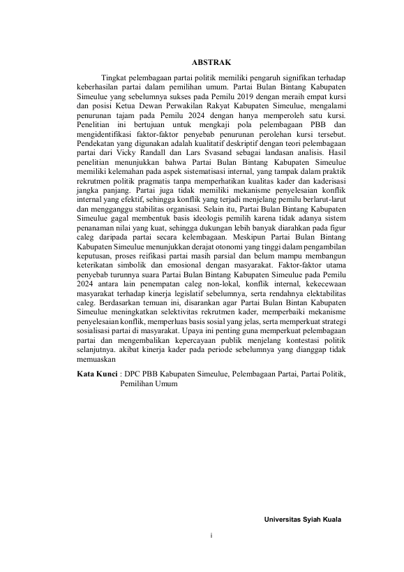 Yomas, ANALISIS PELEMBAGAAN PARTAI BULAN BINTANG PADA PEMILIHAN UMUM LEGISLATIF TAHUN 2024 DI KABUPATEN SIMEULUE. Banda Aceh Fakultas Ilmu Sosial dan Ilmu Politik-Universitas Syiah Kuala,2025